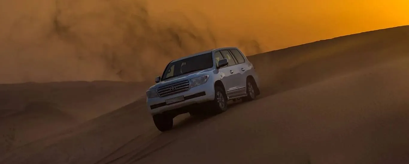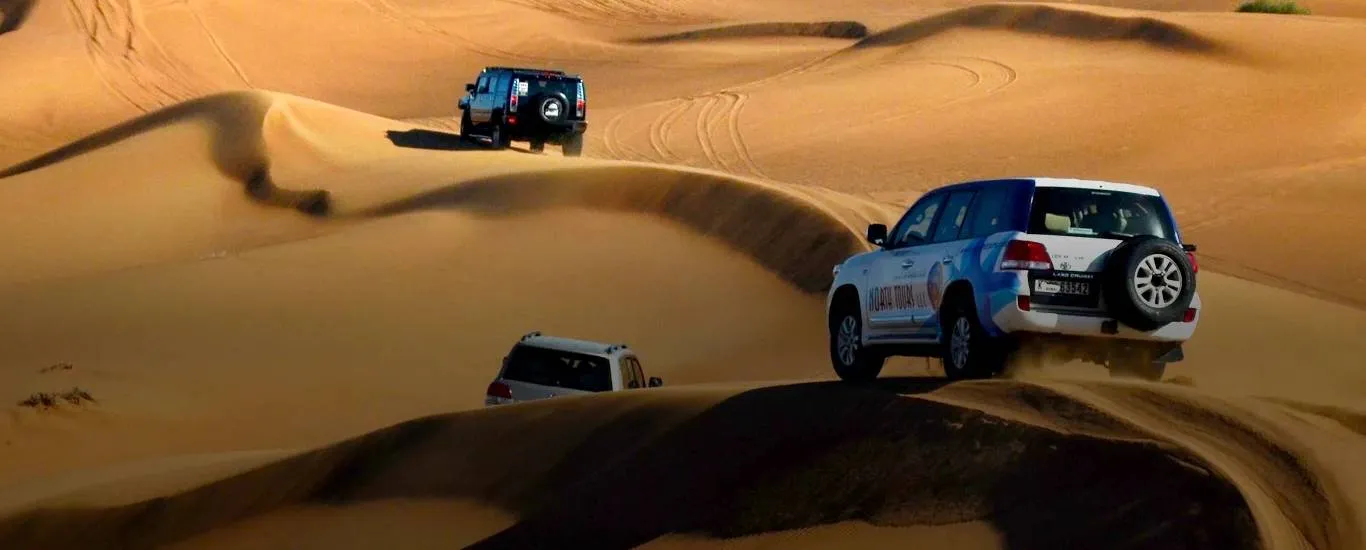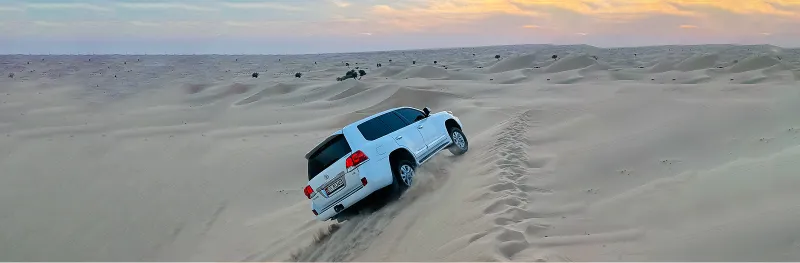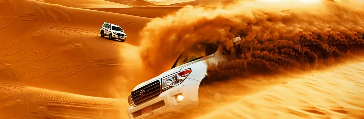 An Abu Dhabi desert safari is a popular tourist activity that involves exploring the vast sand dunes of the Abu Dhabi desert in a four-wheel drive vehicle. It typically includes activities like dune bashing, camel riding and sandboarding, followed by a traditional Arabian BBQ dinner.