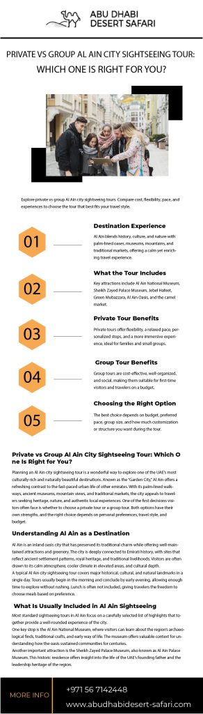 Planning an Al Ain city sightseeing tour is a wonderful way to explore one of the UAE’s most culturally rich and naturally beautiful destinations. Known as the “Garden City,” Al Ain offers a refreshing contrast to the fast-paced urban life of other emirates. With its palm-lined walkways, ancient museums, mountain views, and traditional markets, the city appeals to travelers seeking heritage, nature, and authentic local experiences. One of the first decisions visitors often face is whether to choose a private tour or a group tour. Both options have their own strengths, and the right choice depends on personal preferences, travel style, and budget.